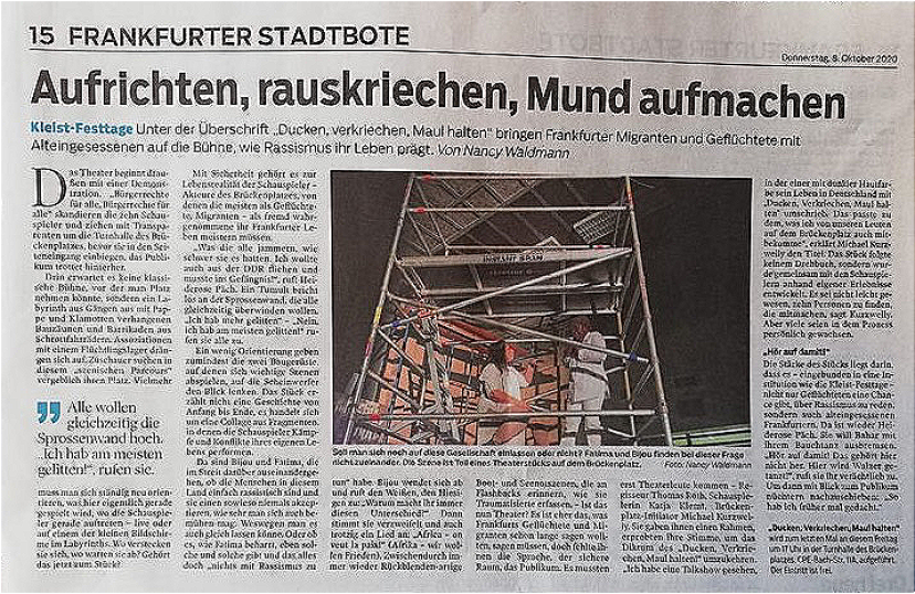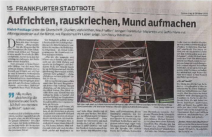 Entanden durch die Zusammenarbeit von migrantischen Akteur:innen, dem Theaterregisseur Thomas Roth, der Regisseurin und Schauspielerin Katja Klemt und dem Bildende Künstler Michael Kurzwelly beschäftigt sich die Kunstinstallation mit den Themen Vertreibung, Flucht, Taumata und Ausgrenzung, sowie der Suche nach einer neuen Form von Gesellschaft.