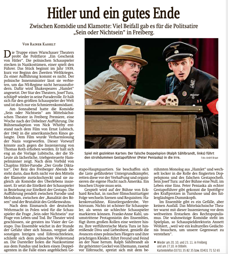 Am Freiberger Theater zeigt die Komödie "Sein oder Nichtsein", wie Nazis überlistet werden können. Mit dem sehr gegenwärtig anmutenden Stoff punktete das Ensemble beim Publikum.